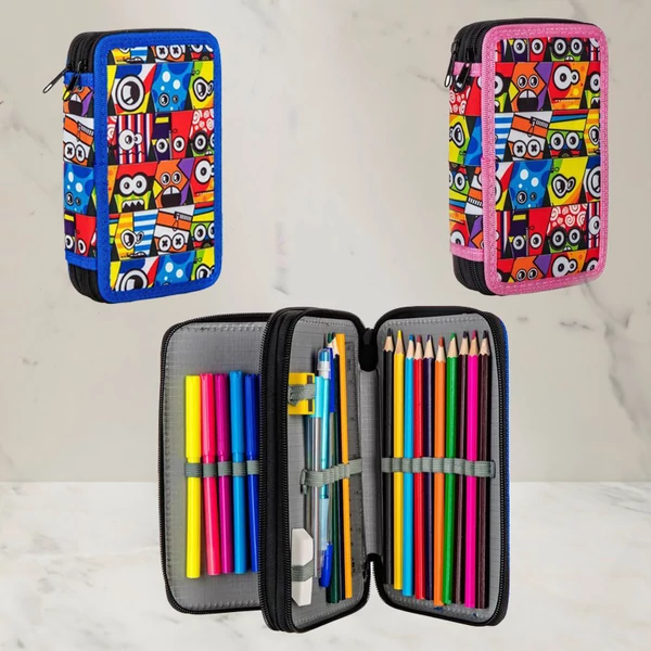 A 13 x 19,5 cm méretű, töltött emeletes tolltartó iskolás korú gyerekek nélkülözhetetlen eszköze, 2 színben választható. Minden emelet külön cipzárral zárható.