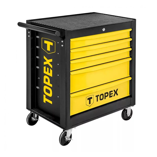 TOPEX Szerszámtartó szekrény mérete 680 x 460 x 825 mm. A szekrény 5 praktikus szerszámtartó fiókot tartalmaz, melyek központi zárral zárhatók. A fiókok teljesen kinyithatóak, vezető görgőn mozognak, amelyek biztosítják a hosszú élettartamot és a folymatos és üzembiztos működést. A munkapolc felület gumi burkolattal van ellátva, mely ellenáll az olaj és az egyéb kenőanyagok behatásainak. A négy colos forgó görgők megkönnyítik a szekrénnyel történő manőverezést, egyben blokkolhatók is. Hordképessége 280 kg. A szekrény a vezetést segítő fogantyúval is ellátásra került.