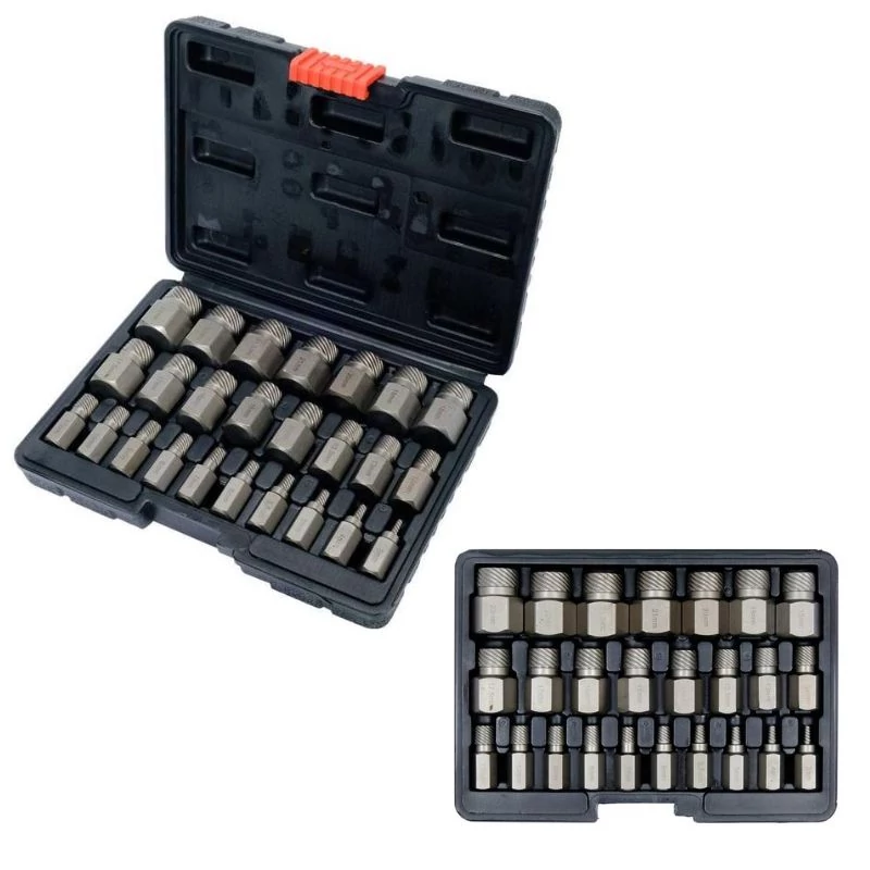 Professzionális csavarkiszedő és anyaeltávolító készlet, amelyet berágódott, megsérült vagy elnyílt fejű csavarok, anyák és csapszegek eltávolításához terveztek. A speciális kialakítású dugókulcsok biztos fogást nyújtanak, így a legmakacsabb rögzítéseket is biztonságosan oldhatod anélkül, hogy további sérülést okoznál.