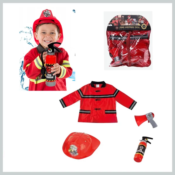 Tűzoltó szett egyenruhával. A csomag tartalma: egyenruha, fogas, sisak, tűzoltó készülék, megafon (nem elemes és hatások nélkül).