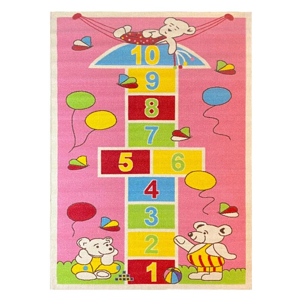 Vidám, ugróiskola mintás gyerekszőnyeg, amely játékosan fejleszti a gyermekek mozgáskoordinációját és színfelismerését. A színes, számokkal díszített minta és a kedves macifigurák barátságos hangulatot teremtenek a gyerekszobában. A puha, mégis tartós polipropilén anyag kellemes tapintású, a latex-gumi hátoldal pedig biztosítja a csúszásmentességet a biztonságos játék érdekében.