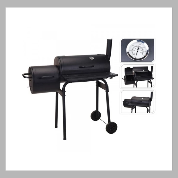 A füstölős BBQ-ban az elkészített étel ízesebb lesz, a hús és a hal lédús marad, mert kevesebb lé megy el, mert alacsonyabb hőmérsékleten lehet grillezni. Emellett finom, különleges, füstös ízűek lesznek az ételek. 106 x 63 x H110 cm főzési magasság nagy füstölő kamra: 79 cm horganyzott acél/fém alkalmas faszénhez vagy briketthez