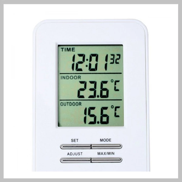 Praktikus hőmérő, amely egyaránt alkalmas a beltéri és kültéri hőmérséklet jelzésére. 1,4 m-es vezetékes hőmérő szondával ellátott. A termék előnye, hogy óraként is funkcionál (12/24 órás időformátum, dátum). Elhelyezése könnyen megoldható: akasztható falra vagy helyezhető asztallapra. A termék tápellátása: 2 X 1,5 V (AAA) elem.
