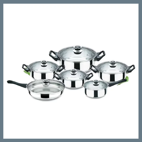 Ez a 12 részes rozsdamentes acél edénykészlet hőálló üvegfedőkkel és hőszigetelt bakelit fogókkal rendelkezik, így kényelmes és biztonságos használatot biztosít. Ideális mindennapi főzéshez, mivel tartós, könnyen tisztítható, és modern kialakításának köszönhetően bármilyen konyhába illik.
