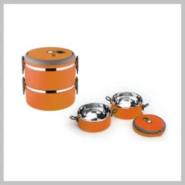 Kétrészes rozsdamentes acélból készült színes ételhordó.