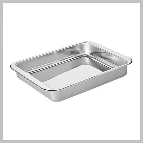 Ez a négyszögletes rozsdamentes acél tepsi tökéletes választás sütéshez, melegítéshez vagy tálaláshoz. Letisztult kialakítása és időtálló anyaga miatt univerzálisan használható minden konyhában – legyen szó otthoni főzésről vagy professzionális konyhai munkáról.
