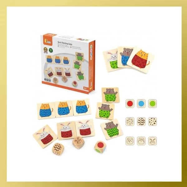 A fából készült gyors kitaláló és párosító játék nagyszerű társasjáték gyerekeknek és családoknak. A gyermek feladata, hogy kiválasztott számú kockát dobjon (1-től 3-ig), és megtalálja a megfelelő állatot a megfelelő mintákkal és színekkel a ruhákon. A kártyák fából készültek és nem mérgező festékekkel vannak festve. A játék fejleszti a gyerekek érzékenységét, logikus gondolkodását, koncentrációját és finommotorikáját.