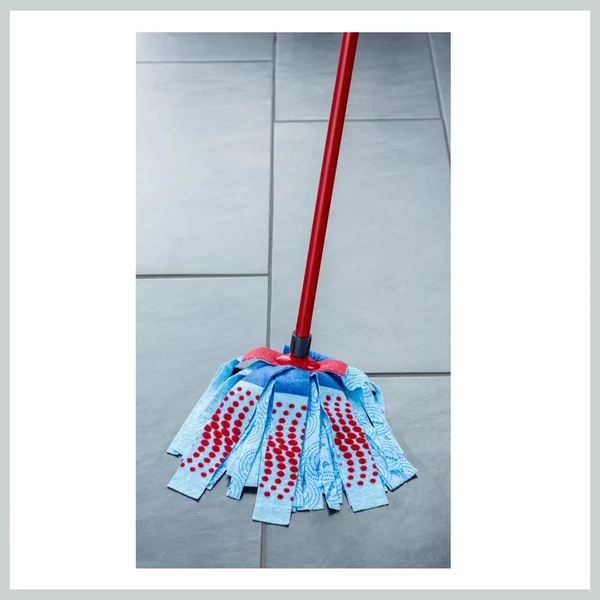 A Vileda SuperMocio felmosófej hatékony és praktikus megoldást kínál a padlók tisztítására. A különleges mikroszálas és piros súrolópöttyökkel ellátott csíkos kialakítás garantálja a makacs szennyeződések és foltok eltávolítását, miközben kíméletes a padló felületéhez.