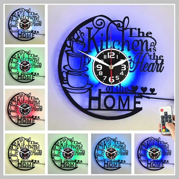 Ez a kézzel készített, egyedi hanglemez falióra nem csupán praktikus időmérő, hanem egy igazán stílusos és különleges konyhai dekoráció is. A „The Kitchen is the Heart of the Home” (A konyha az otthon szíve) felirattal ellátott design szívhez szóló üzenetet közvetít, miközben a beépített 7 színű LED világítás hangulatos fényt ad a térnek. Tökéletes választás karácsonyra, Valentin-napra, újévre vagy lakásavatóra.
