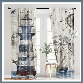Dobja fel otthonát az óceán hangulatával! Ezek a vintage tengerészeti témájú függönypanelek különleges vitorlások, sirályok, világítótorony és iránytű nyomtatással készültek, melyek egy faerezetű háttéren kelnek életre. A természetes hatású mintázat tökéletesen illeszkedik nappaliba, hálószobába vagy akár konyhába is.