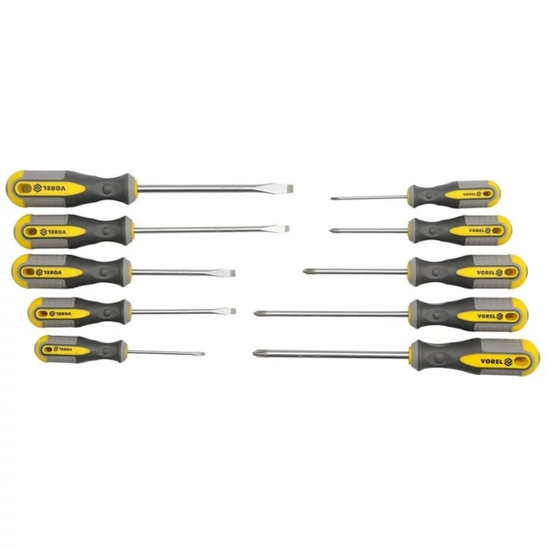 A Vorel 60970 csavarhúzó készlet 10 darabból áll, króm-vanádium (CrV) acélból készült. A hegyek szatinált felületűek, homokfúvottak és mágnesesek, így biztos fogást nyújtanak a csavarfejen. A nyelek kétkomponensű műanyagból készültek, a végükön lévő nyílás lehetővé teszi a csavarhúzók felakasztását.