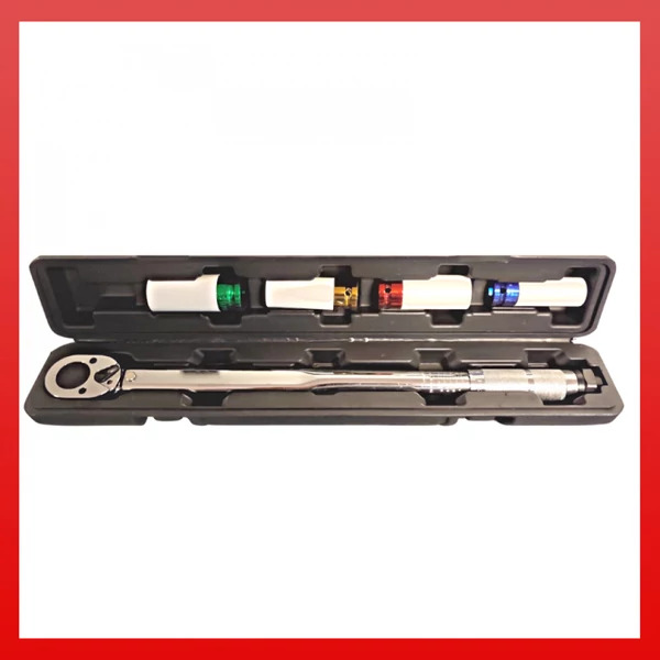 A nyomatékkulcs és a tartozékok masszív műanyag tokban vannak tárolva.