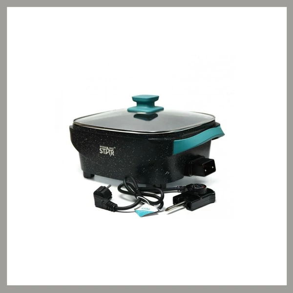 A WINNING STAR ST-9802 egy sokoldalúan használható, 6,5 literes kapacitású elektromos serpenyő, amely ideális sütéshez, pároláshoz, melegítéshez vagy akár főzéshez is. A tapadásmentes bevonattal ellátott mély sütőtál könnyen tisztítható, a hőszigetelt fogantyúk pedig biztonságos kezelést biztosítanak.