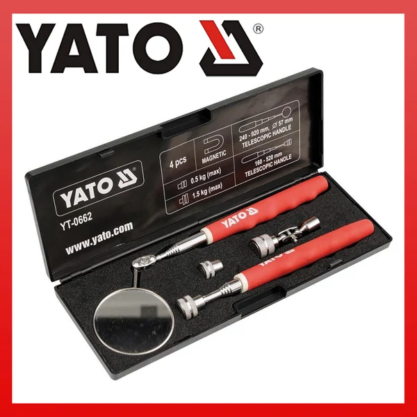 A YATO márkaellenőrző készlet támogató munka a különböző iparágak professzionális műhelyeiben és szolgáltatásaiban. Az ellenőrző tükör lehetővé teszi a láthatatlan, rejtett helyek vizsgálatát, a mágneses markoló pedig arra szolgál, hogy apró fémtárgyakat húzzon ki repedésekből és lyukakból. A tükör és a megfogó egy teleszkópos karra van szerelve.