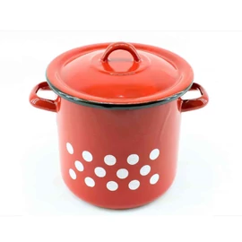Nagy méretű, hagyományos stílusú zománcozott fazék, élénk piros színben, fehér pöttyökkel díszítve. Klasszikus megjelenésével a régi idők hangulatát idézi, miközben praktikus és sokoldalú konyhai segítőtárs. Tökéletes választás nagyobb mennyiségű leves, főzelék, lekvár vagy befőtt elkészítéséhez.